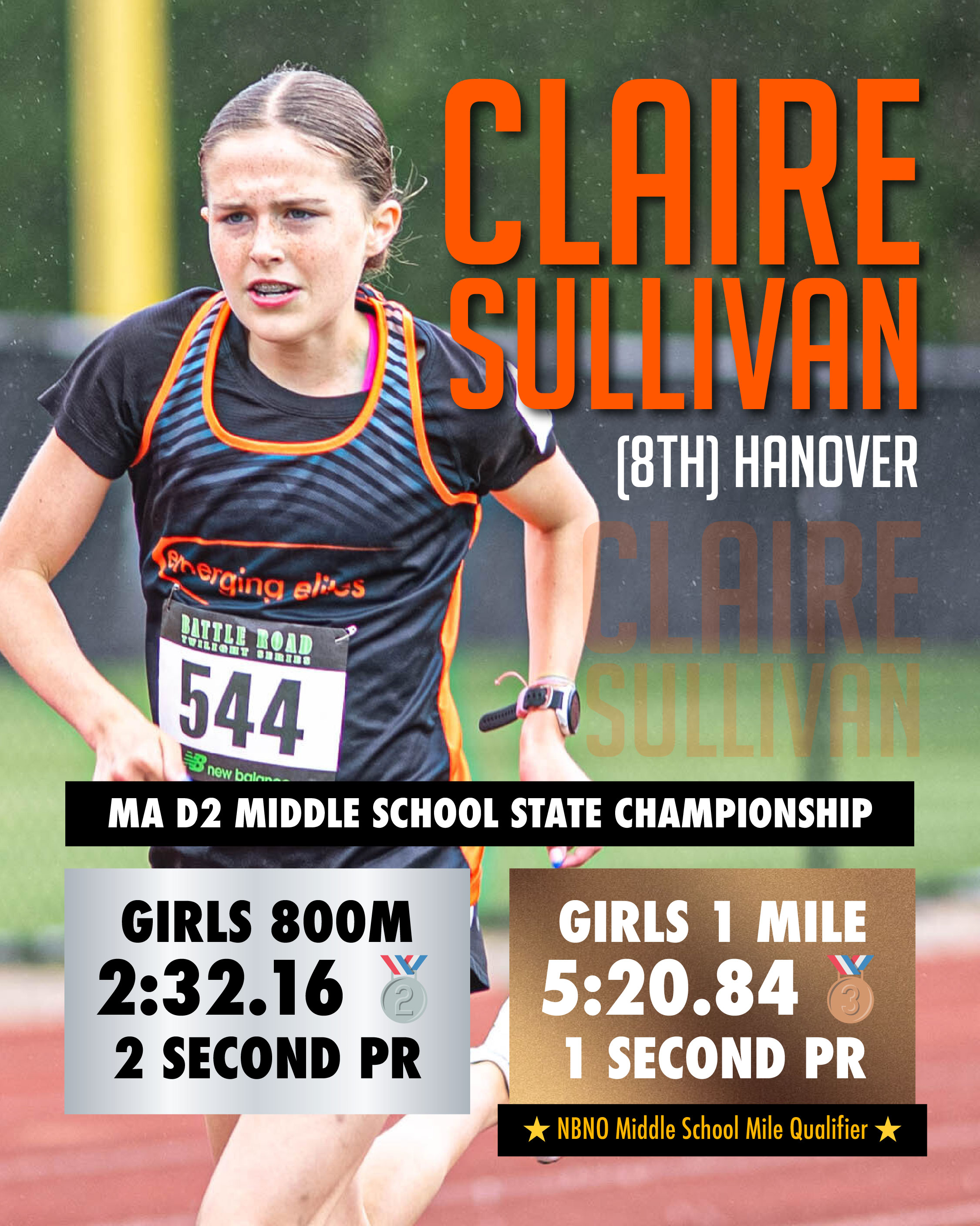 2025 NBNO Middle School Mile Qualifier 2025 MA D2 Middle School State Championship 800m Runner-Up 2025 MA D2 Middle School State Championship Mile, 3rd place 2025 Adrian Martinez Girls Middle School Mile Champion 2025 South Shore Track and Field Middle School Mile Champion