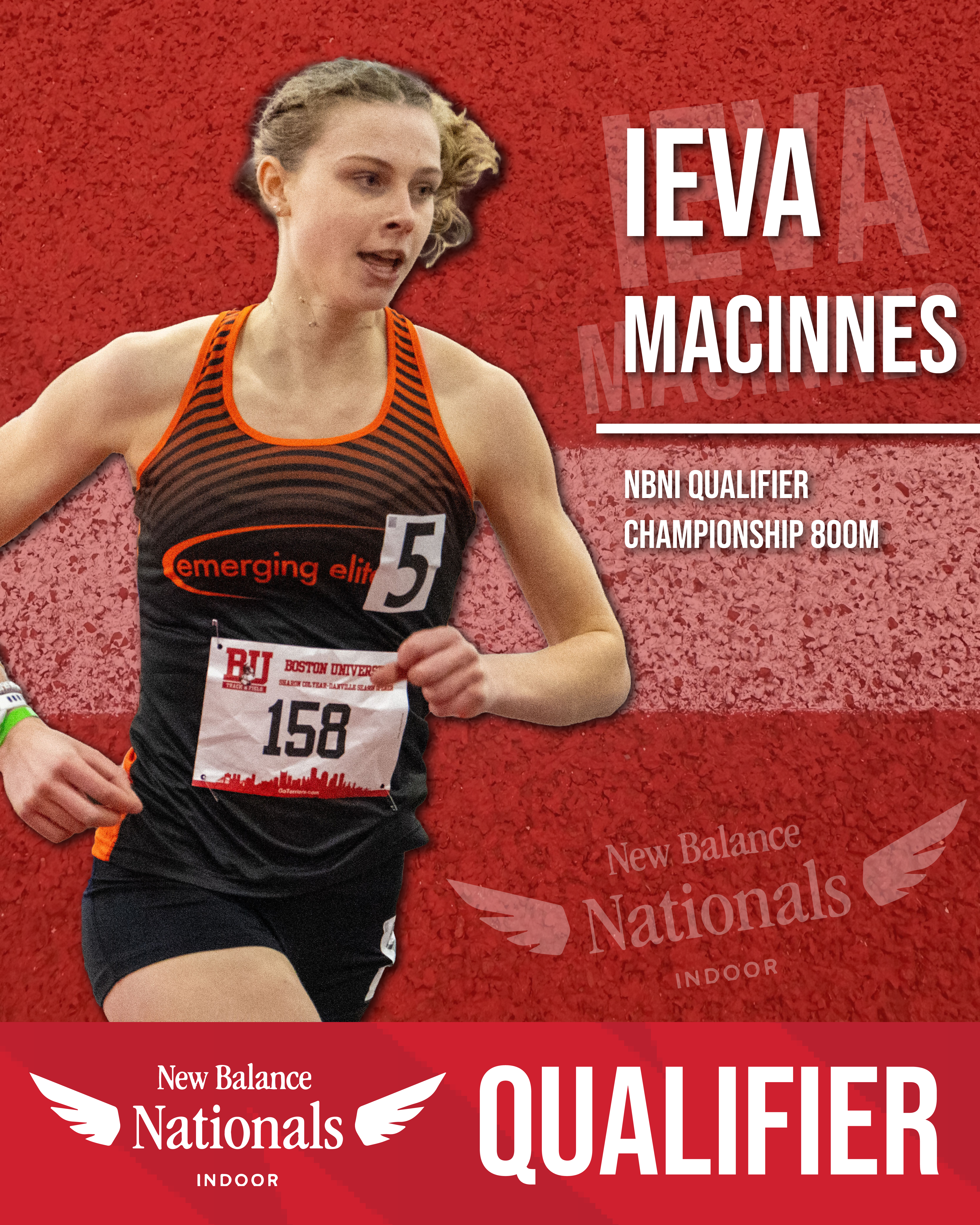 Fueled by her experience at Foot Locker Northeast Regionals, Ieva was eager to attack her first ever season of indoor track. Ieva opened her season in December by debuting in the 3000m, running 10:18.60 and qualifying for the New Balance Nationals Indoor Championship 2 Mile. She then focused on developing her speed and dropped down to race shorter distances. Competing in congested collegiate and post-collegiate fields at Boston University, Ieva debuted in the 1000m in 2:57.51 and lowered her mile personal best by 26 seconds, running 5:04.96. By February of her debut indoor season, Ieva had qualified for the New Balance Nationals Indoor Championship 800m, mile and 2 mile.